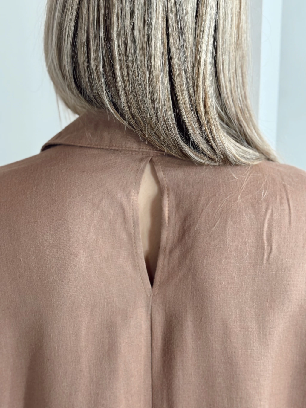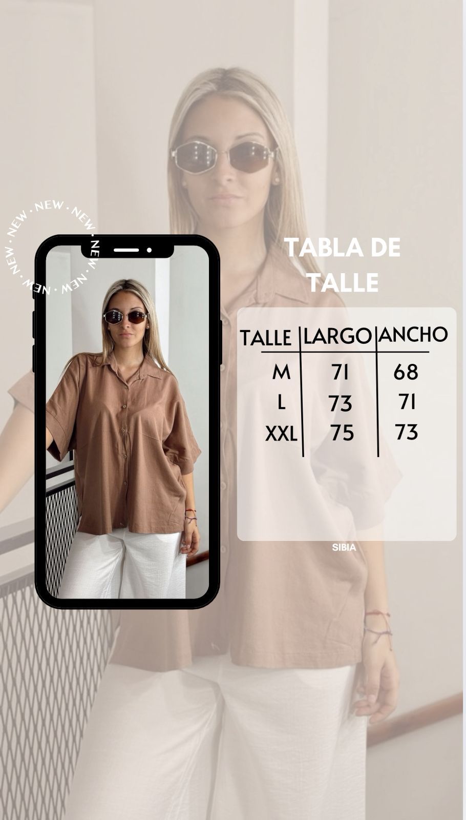 Camisa oversize de lino con mangas cortas y botones frontales, un diseño fresco y moderno ideal para todos los días. Su corte amplio aporta comodidad y caída fluida, mientras que el detalle de abertura lágrima en la espalda le da un toque distintivo y femenino.
