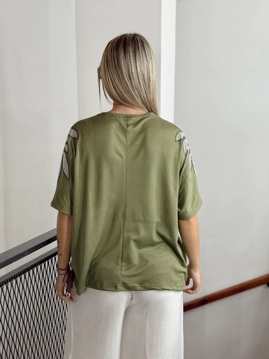 Un básico con un toque sofisticado. Remerón de modal suave y fresco, de corte amplio y relajado que brinda comodidad y estilo. Su detalle de strass aplicado en los hombros resalta la prenda, aportando un brillo sutil y moderno.