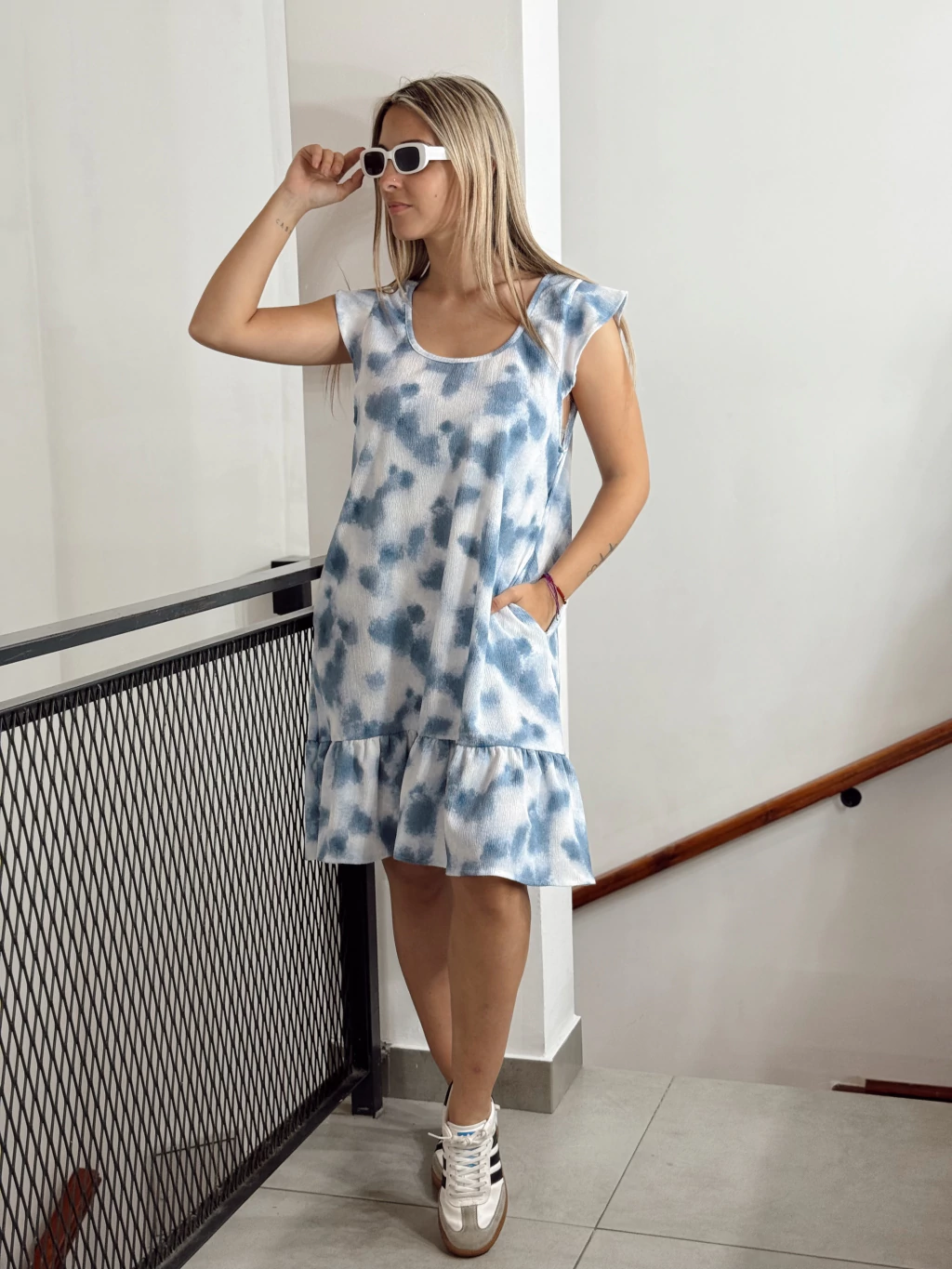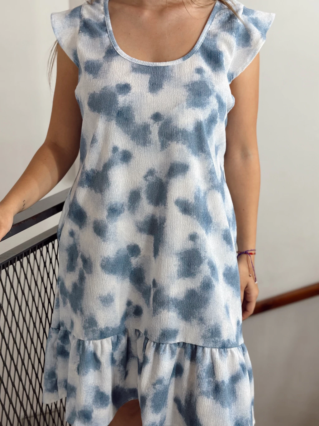 Vestido de bambula con bolsillos laterales, fresco y cómodo para el día a día. Su diseño con volado en el ruedo y estampado en tonos celeste aporta un aire juvenil y relajado, ideal para un look casual con estilo. Liviano, práctico y versátil, perfecto para acompañarte en esta temporada.